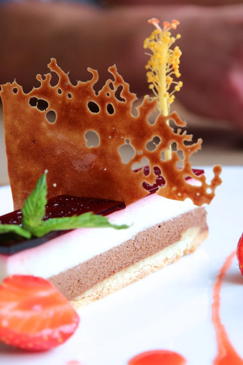 Inzwischen sitzen wir mit Anne und David an einem der großen Tische, die das Lokal bevölkern. Vor uns ein zauberhaft arrangiertes Dessert. Die Sonne scheint auf den weißen Teller, der strahlt wie frisch gefallener Schnee. Anne, impulsiv, ein Lächeln im Gesicht und mit Fingernägeln so rot wie Davids Schürze, und er, fröhlich, aufgekratzt trotz der vielen Arbeit, warten auf unsere Fragen. Noch ein Löffel von der Mousse. Mhmmm. Dann geht es los.