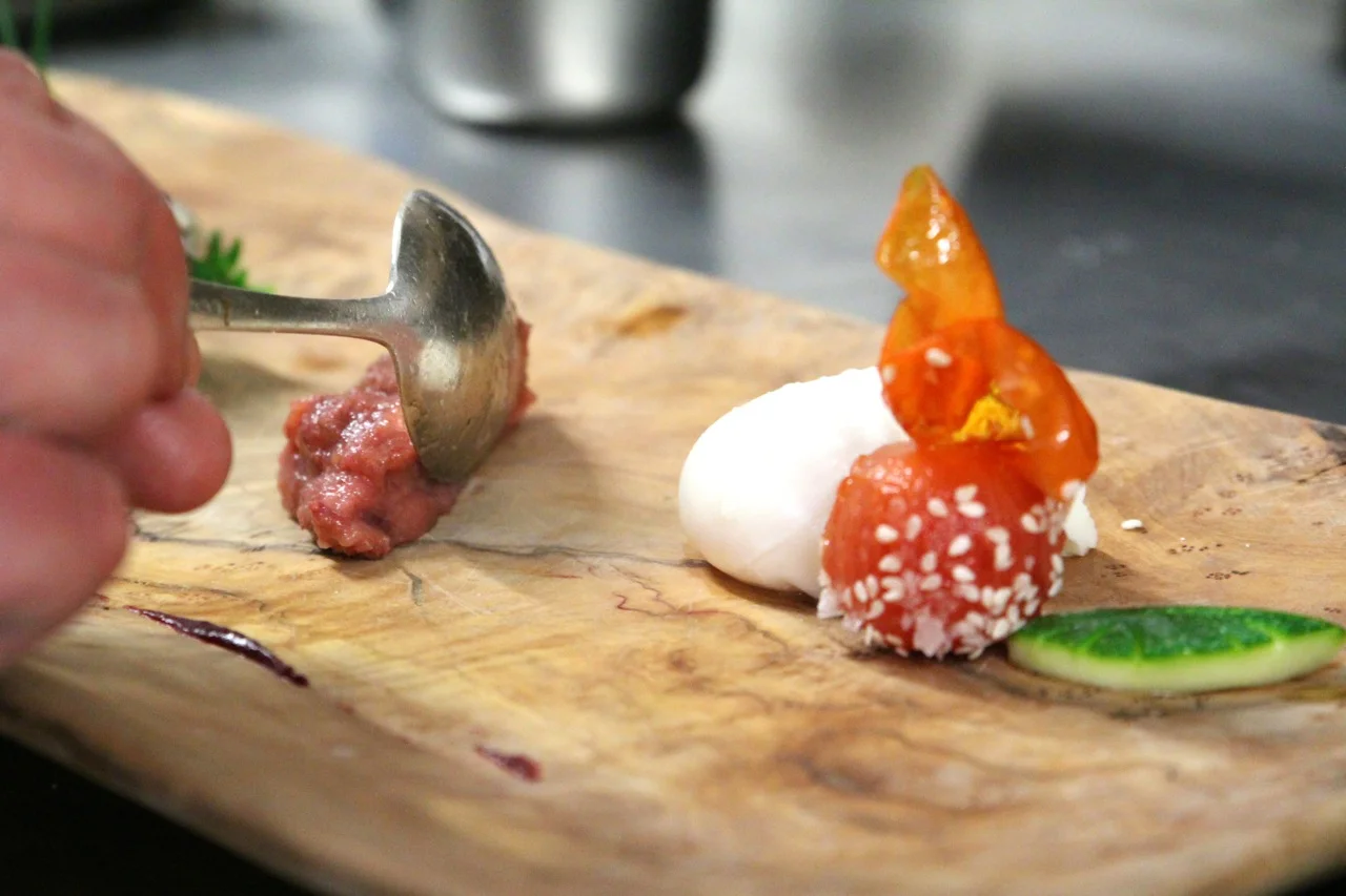 Jetzt tun wir etwas, was wir sonst selten tun: Wir suchen unsere Gastgeber in der Küche heim, um sie zu loben, zu loben, zu loben. Und erleben eine kleine Überraschung. Denn nicht alle Gerichte werden in der offenen Küche oben im Gastraum zubereitet. Es gibt eine weitere im Keller. Und da werkelt David, dem man vor allem eins ansieht – die Leidenschaft für sein Tun. So bereitet er gerade eine Fischplatte vor, mit Labskaus und einer in Sesam getunkten Tomate, die aussieht wie ein kleines Kunstwerk, und mit einem Ei. Die Küche, in der das passiert, ist klein. Ihre Ausstattung eher, äh, ja nennen wir es mal euphemistisch: reduziert, der ganze Stolz ist die neue Küchenmaschine, die man "Hengst" nennt. Und während David das Essen anrichtet, hebt er an zu einer kleinen Philosophie über das Ei. Das Ei sei ein Geschenk der Natur, mit dem Ei könne man so viel machen, das Ei sei sehr nahrhaft, das Ei habe so eine enorme Geschmacksvielfalt...