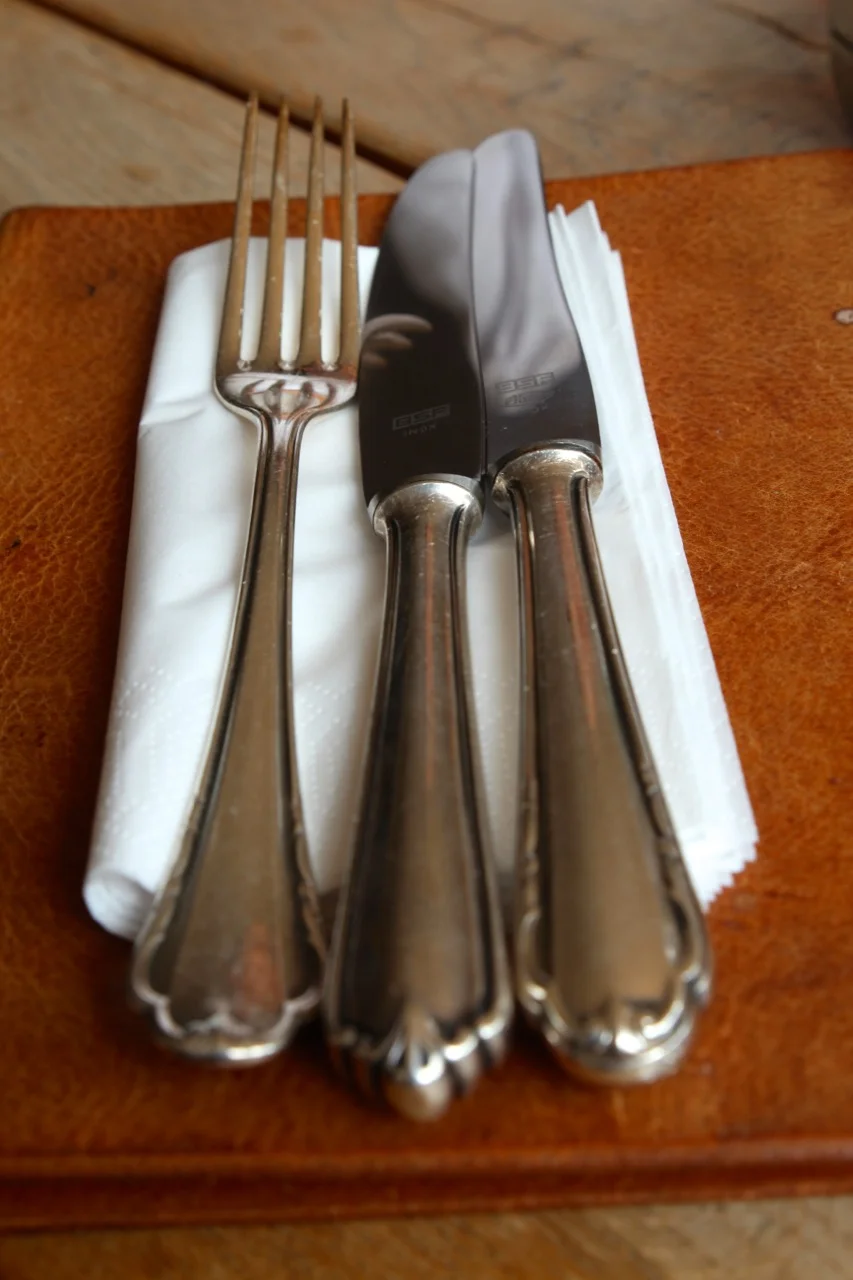 Eine Speisekarte gibt es nicht. Die kleine Kellnerin baut stattdessen eine überfrauhohe Tafel vor uns auf: Als Vorspeise dürfen wir wählen aus Salat und Burrata, als Hauptgang wird angeboten Kabeljau auf Risotto oder Tafelspitz mit Kartoffelstampf (wie Pürree neumodisch heißt), als vegetarische Variante finden wir eine Quiche auf der Tafel, zum Dessert gibt es eine Erdbeer-Creme.
