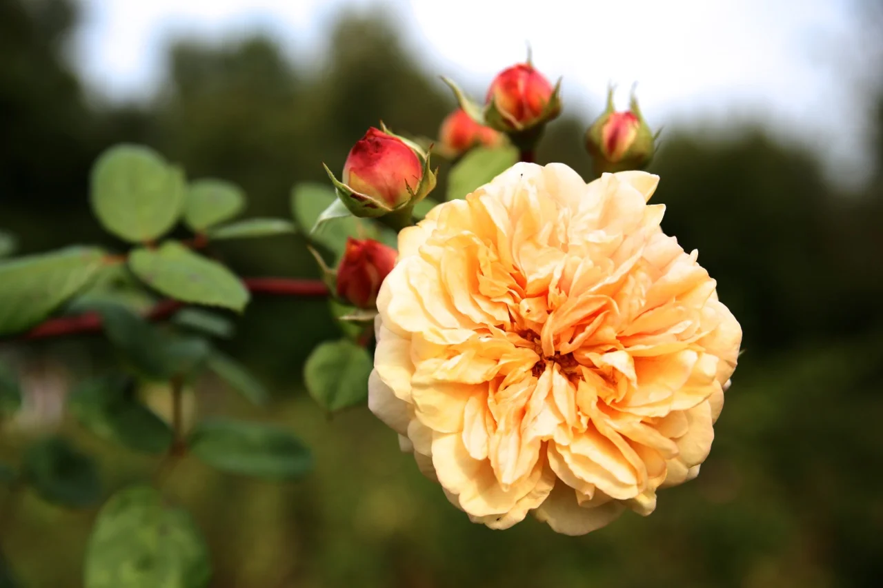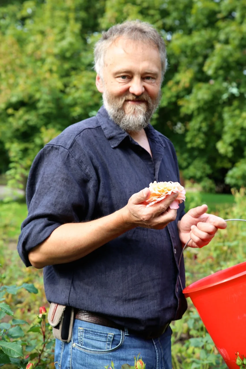 Sven nimmt eine in ihrer ganzen Pracht aufgeblühte und wundervoll nach Aprikose duftende Rose in die Hand. Es ist eine deutsche Sorte mit großer, buschiger Blüte in zarten Pastelltönen und dem Namen einer Prinzessin „Augusta Luise". Sven umfasst die Blüte nun. „Schaut, ihr haltet sie an den äußeren Blättern fest und dreht diese dann mit den Stängel ab.“